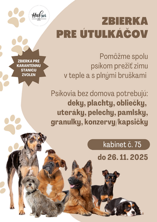 Školský parlament organizuje zbierku pre útulok KS Zvolen. Pomôžte darovaním diek, krmiva či pamlskov do 26.11.2025.