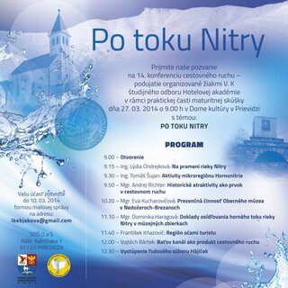 Aj organizácia konferencie o cestovnom ruchu môže byť formou praktickej maturitnej skúšky. Už štrnástykrát sa tejto úlohy zhostili žiaci piateho ročníka odboru hotelová akadémia. Kultúrne a spoločenské stredisko v Prievidzi bolo 24. marca 2014 miestom, kde sa prednášalo, diskutovalo a premietalo na tému „Po toku Nitry“.