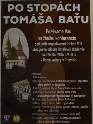 Dňa 26.3.2015 žiaci hotelovej akadémie zorganizovali v Dome kultúry v Prievidzi 15.ročník konferencie CR na tému Po stopách Tomáša Baťu v rámci svojej praktickej maturitnej skúšky. Konferenciu svojim príhovorom slávnostne otvoril riaditeľ SOŠ OaS PaedDr. Štefan Gaman. Konferencie sa zúčastnili vzácni hostia z radov pamätníkov, zamestnancov podniku Tomáša Baťu na Hornej Nitre, ktorí vo svojich vystúpeniach oboznámili prítomných o tom, ako žili a pracovali pod vedením Tomáša Baťu. Ich prítomnosť na konferencií bola zážitkom pre všetkých zúčastnených. Pozvanie na konferenciu prijali aj hostia z Českej republiky, pán Vojtech Bártek, ktorý informoval o využití Baťovho kanála v CR a pán Pavel Vélev, riaditeľ nadácie Baťova vila v Zlíne, ktorý zastupoval rodinu Tomáša Baťu a veľmi príjemným spôsobom spestril program konferencie. Nezastupiteľné miesto v programe mali aj zástupcovia Klubu Baťovej školy práce v Partizánskom. Veľké poďakovanie patrí aj zamestnancom Mestského múzea v Partizánskom, ktorí ochotne zapožičali exponáty, ktoré dotvárali atmosféru konferencie. S potešením konštatujeme, že maturanti svoju praktickú maturitu úspešne zvládli.